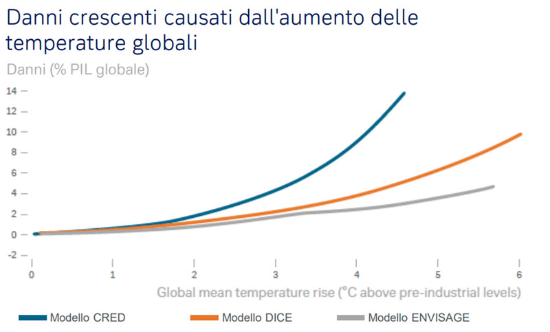 Gli esperti di Deutsche Bank stimano che i danni causati dall’aumento delle temperature in percentuale rispetto al PIL globale potrebbero crescere a dismisura con l’aumento della temperatura media globale implicando ovviamente gravi esborsi monetari oltre che un ingente impiego di risorse per rimediare ai danni.